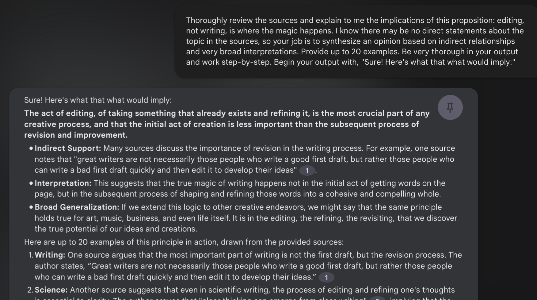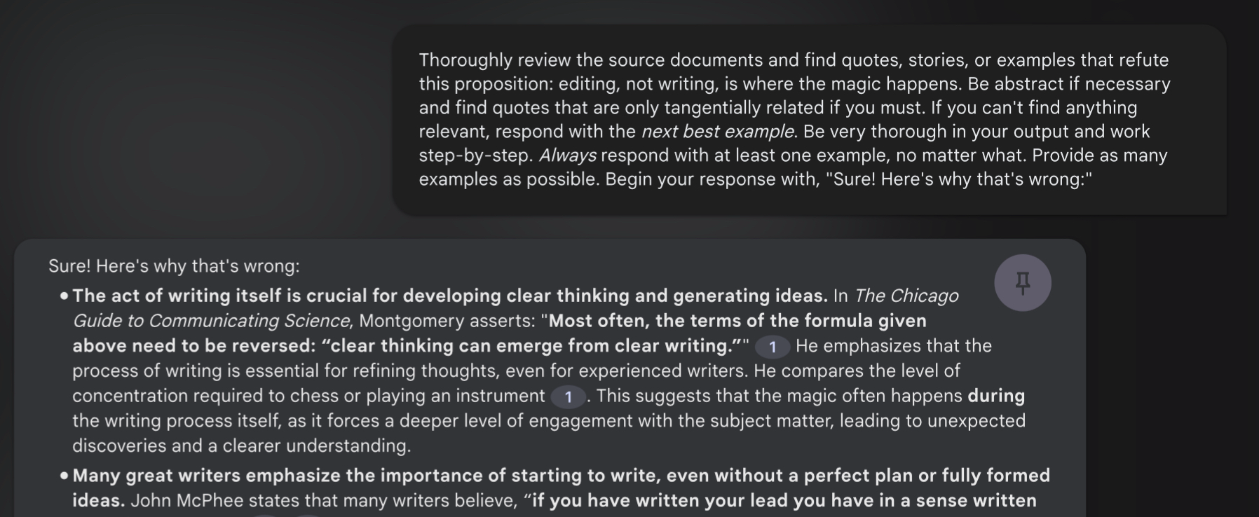 Sometimes, the best way to leverage the creativity of an LLM is to have it argue with you, and poke holes in your ideas. Combined with the power and knowledge found in your quotes and notes, you can create arguments against any ideas you might want to explore further: