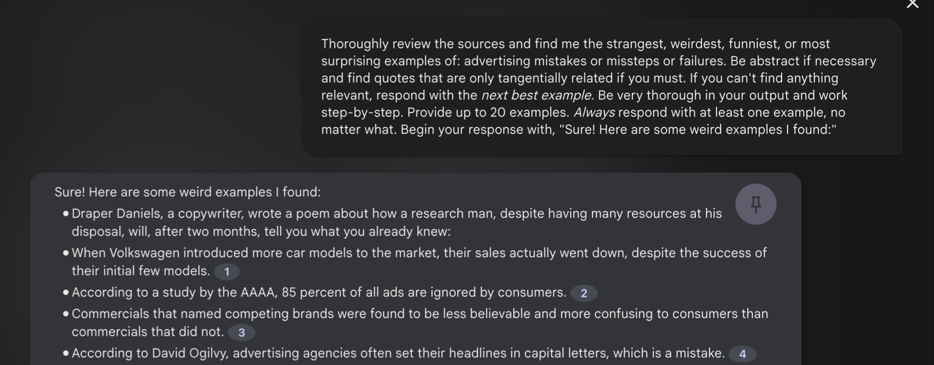 Thoroughly review the sources and find me the strangest, weirdest, funniest, or most surprising examples of: [ ]. Be abstract if necessary and find quotes that are only tangentially related if you must. If you can't find anything relevant, respond with the next best example. Be very thorough in your output and work step-by-step. Provide up to 20 examples. Always respond with at least one example, no matter what. Begin your response with, “Sure! Here are some weird examples I found:”